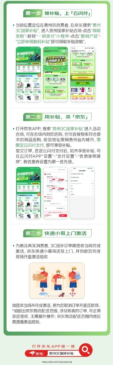 根据国家补贴政策要求,手机等数码产品购新补贴需要现场拆盒激活。京东快递小哥在送货上门时,会协助消费者快速完成现场激活验收,确保消费者能够便捷地享受到补贴带来的实惠。